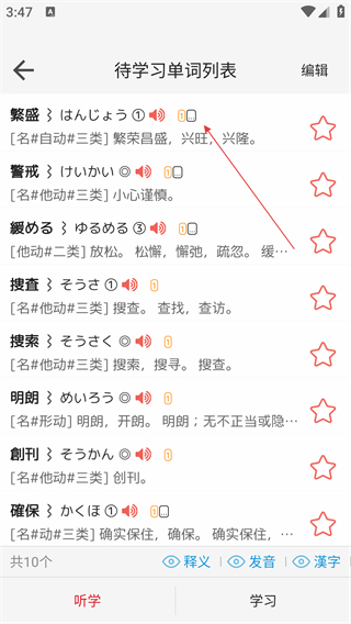 3、在【待学习单词列表】中,选择单词进入详情页,可查看单词的发音、释义等信息。