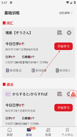 2、在基础训练页找到【词汇】板块,点击对应【开始学习】按钮,进入待学习列表。