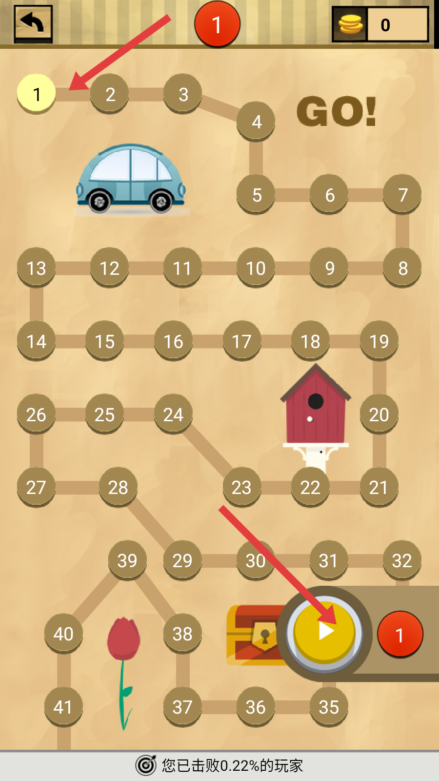 2、选择关卡1,点击黄色播放按钮开始游戏。