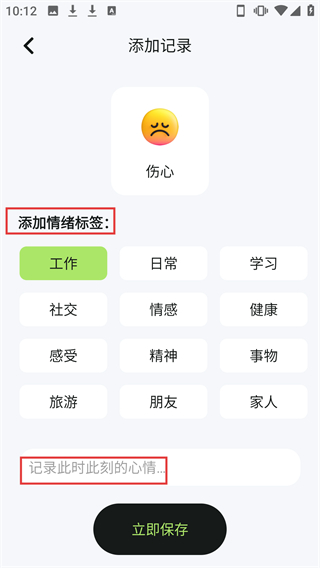 2、进入【添加记录】界面,选择情绪分类,在【记录此时此刻的心情】输入框填写内容后,点击【立即保存】即可。