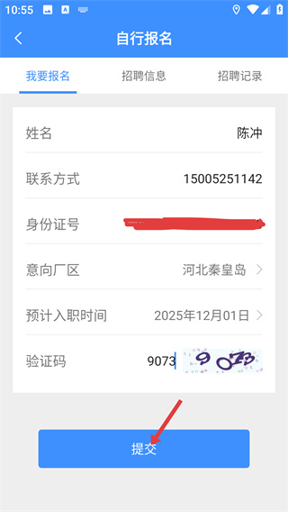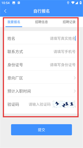 3、在【自行报名】页面的表单中,依次填写【姓名】【联系方式】【身份证号】等信息,选择意向厂区与入职时间。