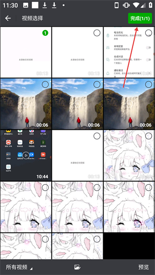 3、在【视频选择】页面选中目标视频,点击右上角的【完成(1/1)】按钮。