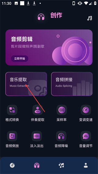 1、点击页面底部的耳机图标,进入【创作】页面。