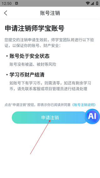 4、在账号注销页面,确认账号安全状态、学习币结清等条件后,点击【申请注销】完成账号注销流程。
