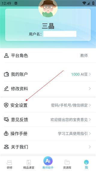2、在个人页面中,选择【安全设置】选项,进入安全管理界面。