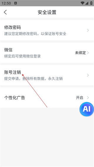 3、在安全设置页面,点击【账号注销】选项,进入账号注销的申请页面。