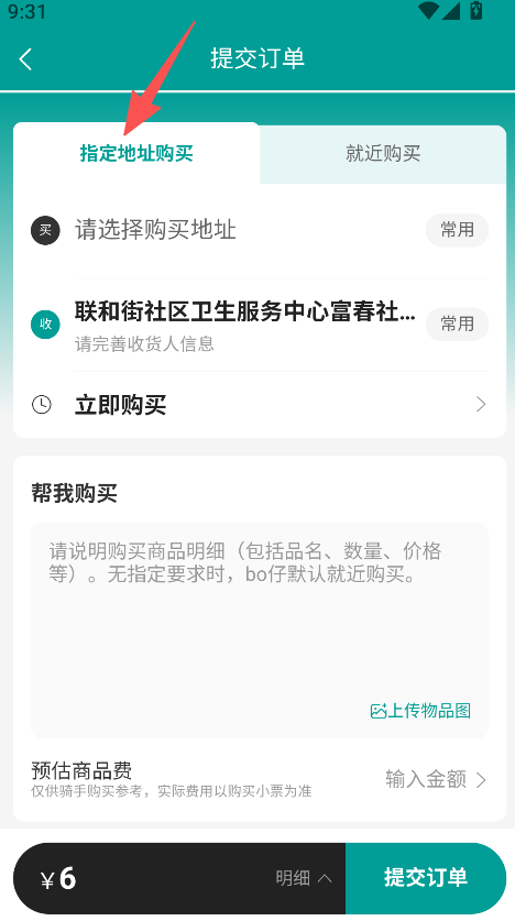 2、支持帮买服务功能,进入帮我买板块后说明商品明细,选择指定地址或就近购买方式,完善收货信息,发起购物需求。