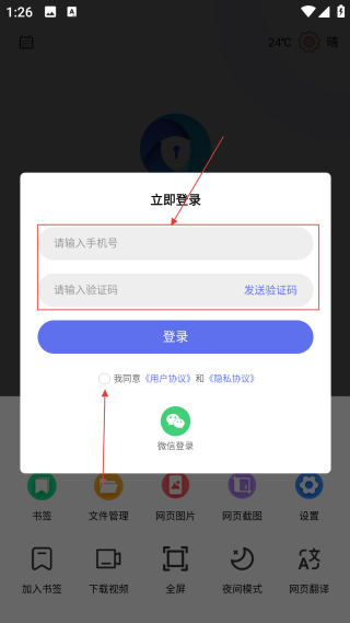 3、在登录弹窗中,填写【请输入手机号和验证码,勾选协议选项】。