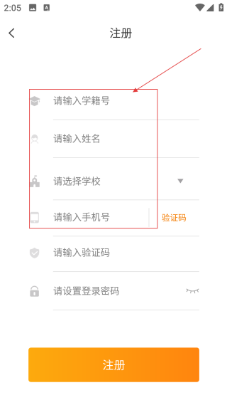 2、在注册页,依次填写【请输入学籍号】等信息,准备注册。
