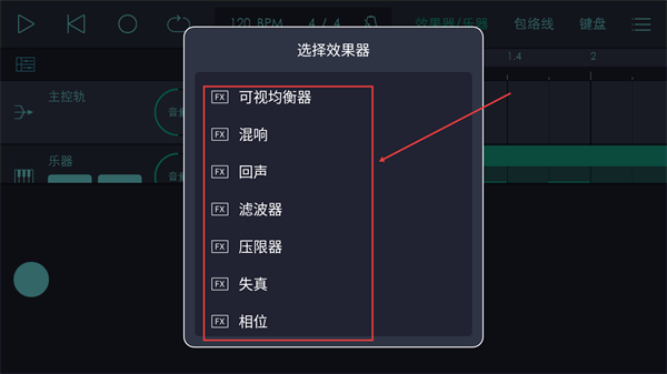 3、打开效果器选择弹窗,选定目标效果器(如【滤波器】)。