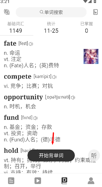 1、进入首页后点击“开始背单词”,可直接进入单词学习页面。