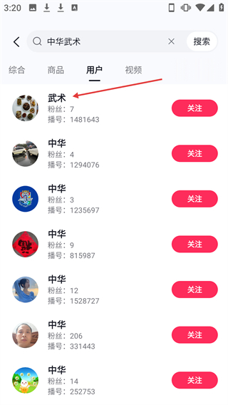 4、在用户列表中,找到目标用户(如昵称含【武术】的账号),可点击对应【关注】按钮完成关注操作。
