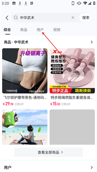 3、在搜索结果页面,点击【用户】标签,切换至用户分类的搜索结果。