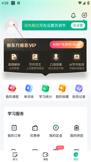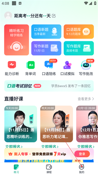 1、在应用首页,可通过【精听练习】【口语新题】等功能进行雅思专项训练,点击底部【我的】可进入个人中心。
