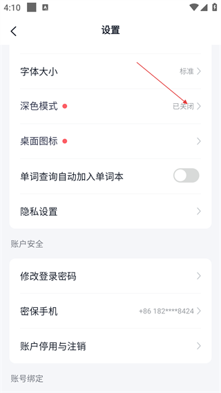 3、在设置界面,可调整【字体大小】【深色模式】等显示选项,点击【深色模式】。