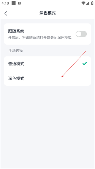 4、进入深色模式设置页,可选择【跟随系统】【普通模式】或【深色模式】,手动切换界面显示风格以适配不同使用场景。