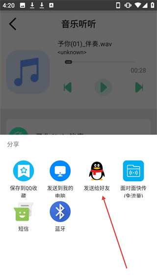 4、在分享渠道界面中选择对应的分享渠道(如【发送给好友】),即可完成该音乐的分享操作。
