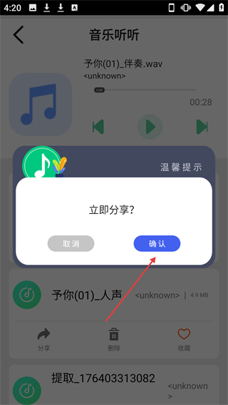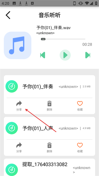 2、在【音乐听听】页面点击目标音乐下方的【分享】按钮,可触发分享相关操作。