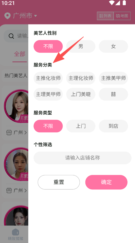 1、提供美艺人筛选功能,可选择地区,设置性别、服务分类、服务类型等条件,筛选出符合需求的美艺人。