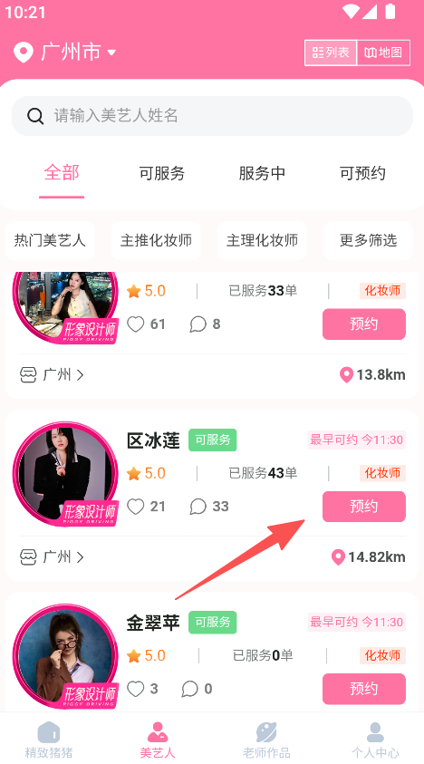 2、确认筛选条件后,浏览美艺人列表,查看评分、已服务单数、距离等信息。