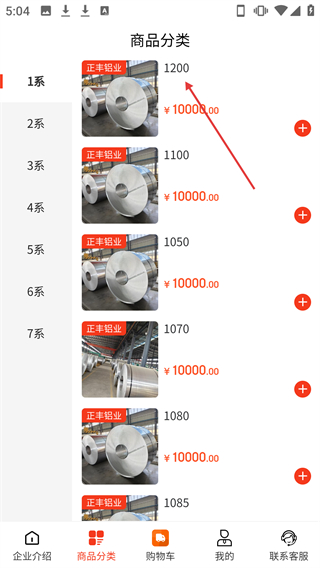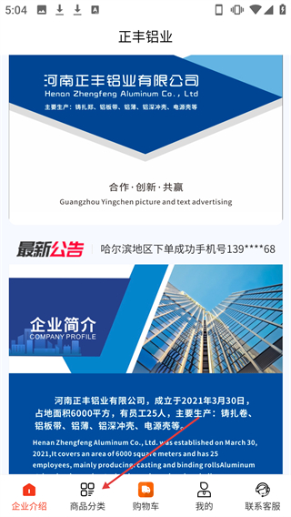 1、在正丰铝业的企业页面,点击底部的【商品分类】选项,即可进入商品分类页面。