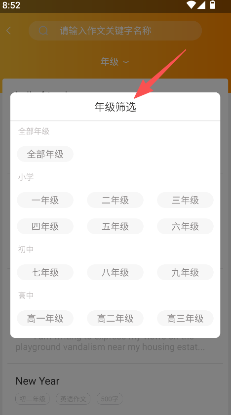 2、支持年级筛选操作,英语写作板块可选择小学初中高中各年级,筛选对应学段的作文内容。