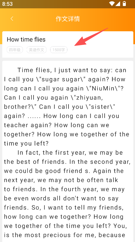 3、展示作文详情信息,含年级、字数及作文正文内容,辅助查看作文的具体内容,满足作文学习的参考需求。