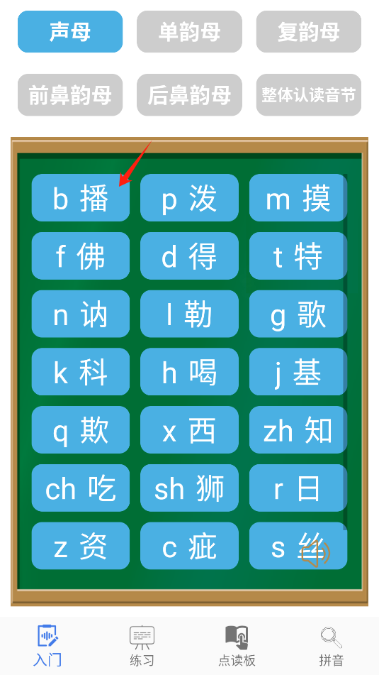 1、打开APP,可在主界面点击声母、单韵母等选项,点击下方的字母学习拼音。