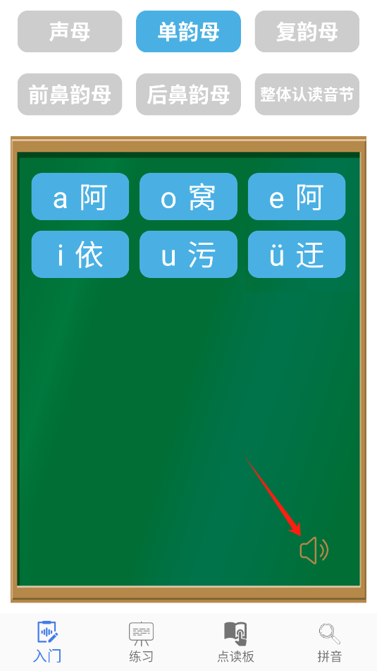 2、点击下方的按钮,可以对上方的韵母进行语音朗读。