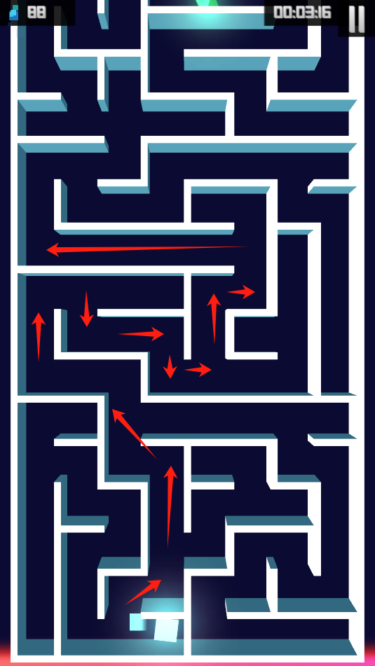 3、可收集迷宫中散落的能量,激活显示正确路径、瞬移、自动行进等辅助能力,延长行进距离。