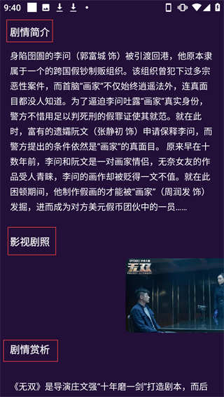 4、在《无双》的详情页面,可查看【剧情简介】【影视剧照】【剧情赏析】等相关内容。