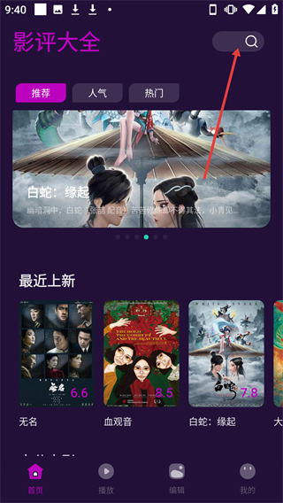 1、在【影评大全】首页点击右上角的搜索按钮,即可进入搜索页面。