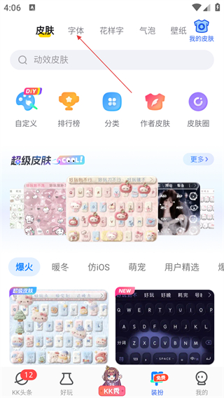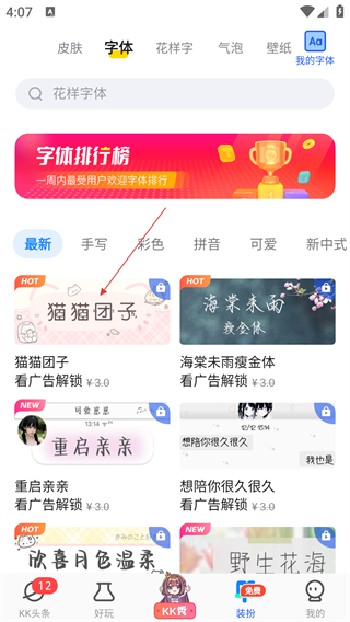 2、在装扮页面中,点击顶部【字体】标签,可切换至字体相关装扮界面。