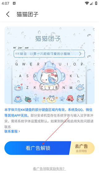 4、在字体详情页,点击【看广告解锁】,可通过观看广告切换该字体进行使用。