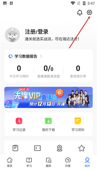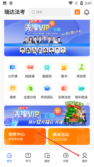 1、进入【瑞达法考】首页,点击底部【我的】进入个人中心页面。