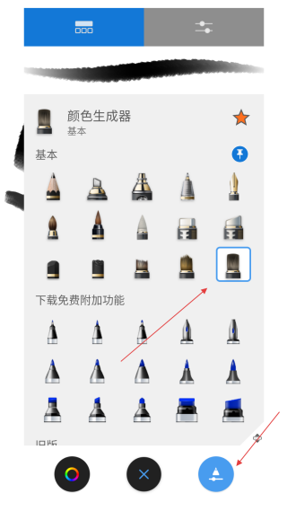 1、点击【顶部画笔工具图标】,打开画笔选择的功能菜单界面。