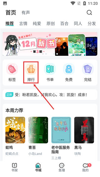 1、在书城首页,点击【排行】按钮,可进入书籍排行榜板块。