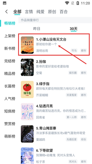 2、进入排行页面后,选择【30天】选项,可查看近30天的作品销量排行。