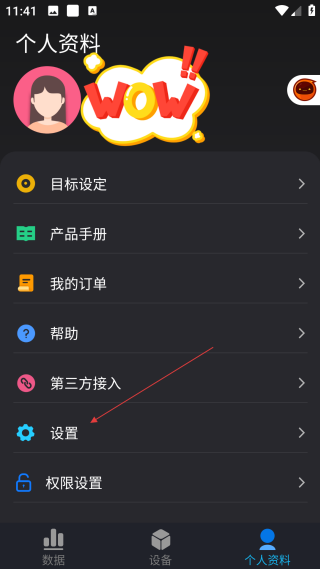 2、在个人资料页,点击【设置】选项,进入设置的功能操作界面。
