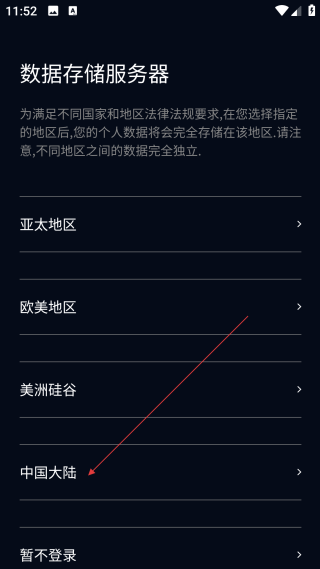 1、在数据存储服务器页,点击【中国大陆】选项,进入登录方式的选择界面。