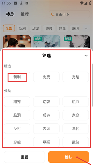 3、在筛选菜单中,选择【新剧】等条件后,点击底部【确认】按钮,即可筛选出对应类型的剧集。