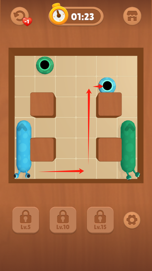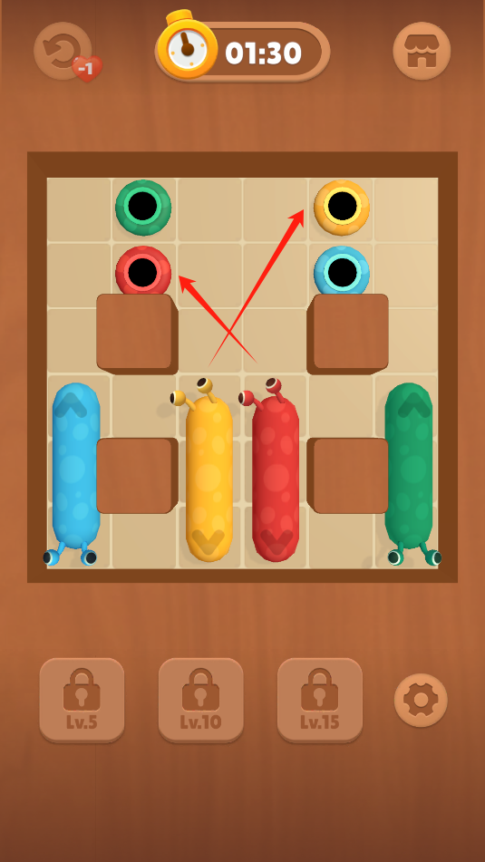 2、游戏中,点击蜗牛滑动,向同颜色的蜗牛壳滑动,让蜗牛进壳里。