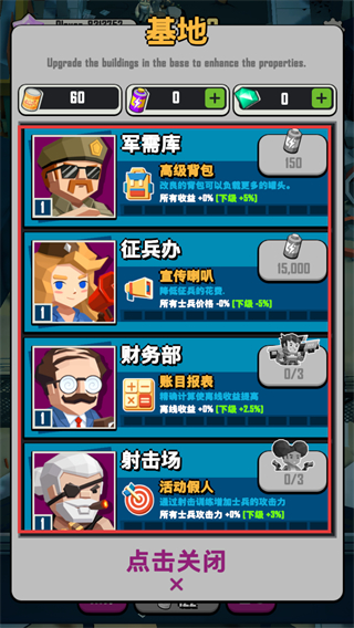 3、进入【基地】界面升级【军需库-高级背包】或【征兵办-宣传喇叭】能提升收益降低征兵花费。