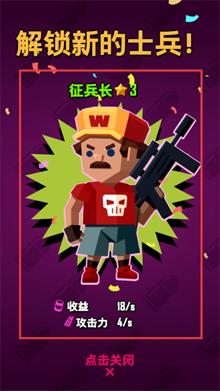 4、解锁新士兵的弹窗出现后,点击【点击关闭】按钮,关闭该提示并继续后续游戏操作。