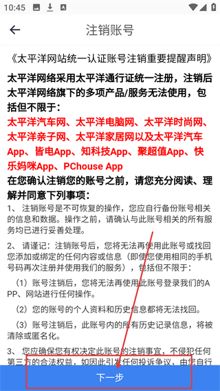 4、阅读注销声明后,点击【下一步】按钮,就能继续进行账号注销的后续流程啦。