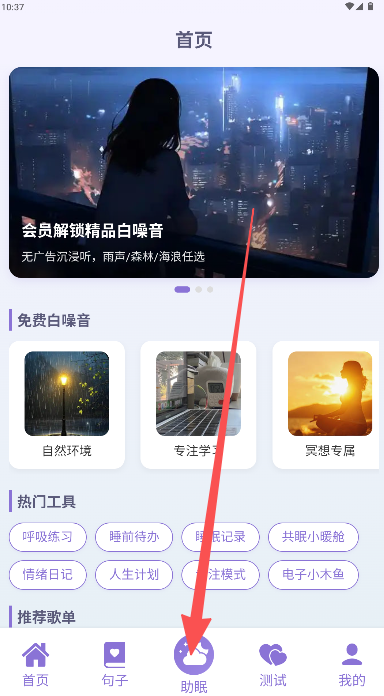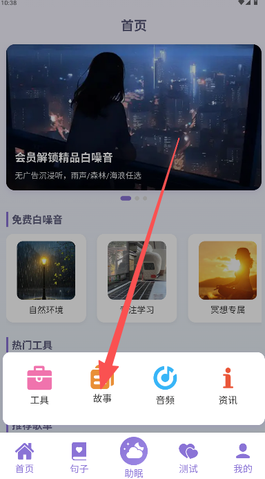 2、内容结构清晰分类,包含白噪音、冥想引导、睡前故事等板块,满足不同场景下的情绪调节需求。