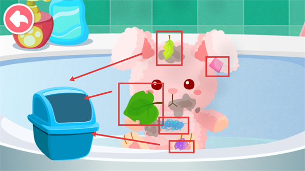 2、将玩偶身上的杂物清理到对应容器中,完成初步的清洁整理操作,推进流程。