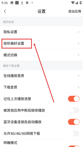 3、在设置页面中,找到【收听偏好设置】选项,点击该选项可进入对应的设置页面。