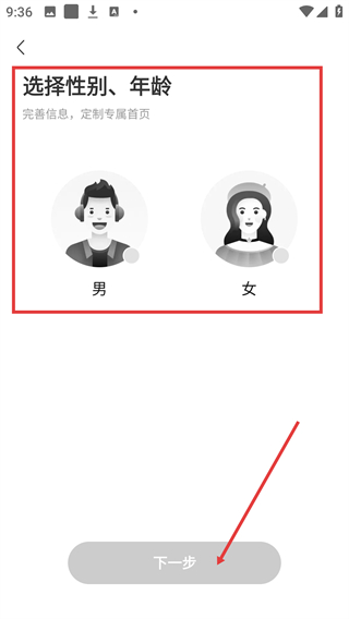 4、进入收听偏好设置后,选择【性别】(男/女),完善信息后可定制专属首页,操作后点击【下一步】。