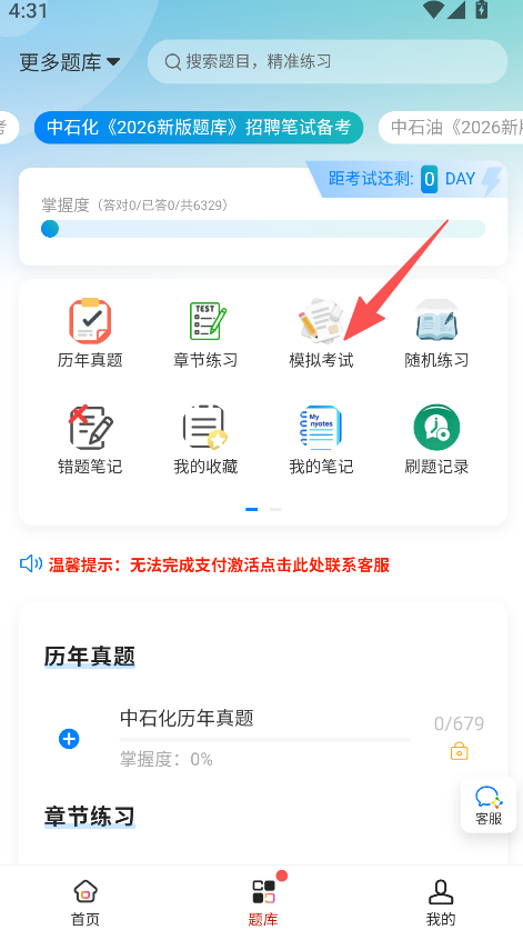 1、打开软件,进入题库板块,点击模拟考试选项。